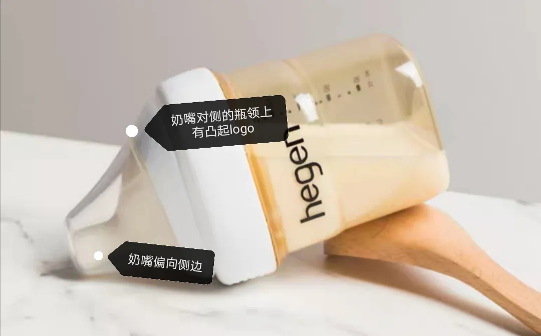 Hegen没有那个孔,是靠奶嘴偏离中心来防胀气。Hegen的奶嘴是在边上的,且瓶领上奶嘴的对面侧有凸起来的logo,晚上喂奶可以用手直接摸,非常方便。(关于瓶领是哪里,我也是第一次知道这个地方叫瓶领……如果它没有这么个名字,我真不知道怎么形容这个东西……)